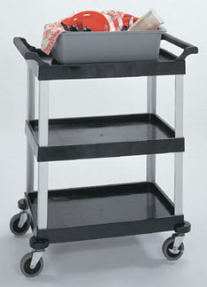 - Standard Duty Utility Cart. Shelves are precision molded from high-density polyethylene to resist stains and odors. Durable, versatile and resists dents. Sturdy black shelves with attractive brushed aluminum legs. Includes nonmarking casters (2 with brake), bottom corner bumpers, and dual push handles. Dimensions: 31 3/4" L x 17 1/2" W x 38" H.