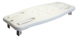 - Portable Bath Bench/Transfer Board Item# 7928-1: Functions as a shower seat and eases transfer in and out of area. Drainage holes in seat minimizes the water built-up. Built in soap dish, Anti-slip rubber pads pevents slip while also protects bath surface. Overall size 31"x 14-1/2". Fits accross bath width 18" - 28-1/4". Maximum weight capacity is 240 lbs.