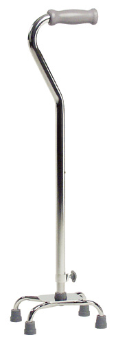 - Small Base Quad Cane, 8" x 6" Base. Color: Aluminum. 4/cs. Offset handle places the user's weight over the base for maximum balance and control. Low profile, 4-point base further enhances stability. Rounded edge base plate helps prevent scraping and bruising of ankles. Attractive finish resists marring and scratching. Easy push-button height adjustment with locking collet for added security. Height adjusts from 30" to 39" in 1" increments. Tool-free left to right hand adjustment is made easily. Chrome-plated steel base is strong and durable. Choice of standard or Ortho-Ease handgrip and silver or bronze finish. Includes laminated color operating instructions. 300 lb maximum weight capacity. Designed to meet the requirements of HCPCS code: E0105. Limited lifetime warranty.