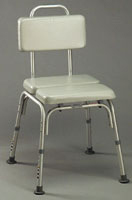 - Shower Chair Deluxe padded with backrest, without arms. Extra strong, watertight heat sealed vinyl padding on seat and back is comfortable, easy to clean and durable. Tool-free assembly. Large seat area for enhanced comfort. Backrest and variable height legs easily adjust: unique flange tips offer superior stability. Rust resistant stain-anodized aluminum. Soft, attractive grey vinyl color. Maximum weight capacity 250 lbs.