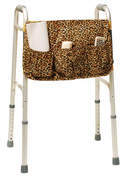 Attaches to most standard walkers, 6 exterior pockets. 100% Cotton. Machine washable. Easily holds: magazines, TV remotes, eyeglasses, medications, bottled drinks. Design: Leopard.
