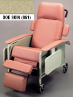 - 577G Clinical Care Recliner, Doeskin color. Designed for use in Dialysis, ICU, CCU and for same day surgery. Newly designed seat and back package for improved patient comfort. Positions from fully upright to full recline for improved positioning. Blow molded side tables are lightweight, sturdy and easy to actuate, holds numerous prep materials. Four swivel casters provide improved maneuverability. 250lb. weight bearing capacity.