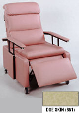 - The Lumex 330 Drop-Arm Recliner combines the therapeutic benefits of position change with a warm residential appearance. The unique drop-arm mechanism permits safe lateral transfer for better risk management. The three-position capability helps alter skin pressure and is ideal for patient room or residential settings. Offers you a choice of flat or pillow back, and an optional tray is available. This model is a beautiful doe skin color.