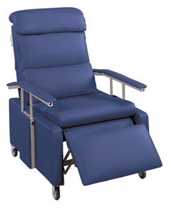 - 3 Position Drop-Arm Recliner, Pillow Back. Color: Royal Blue. Combines the therapeutic benefits of position change with a more residential appearance. Designed to aid in circulation and to help ease discomfort from respiratory, heart and other ailments. Unique drop-arm mechanism facilitates lateral transfers. Easy to activate by caregiver. Three inch ball bearing casters ensure smooth transport; foot actuated swivel locking rear casters for a more secure lock. Unitized welded steel frame for durability. Flame and stain resistant vinyl upholstery available in a variety of colors. Weight Bearing Capacity: 250 Pounds. Lumex Wrap-Around Warranty. Welded Frame: Limited Lifetime. Upholstery: Limited One (1) Year. All Other Components: Limited Three (3) Year.