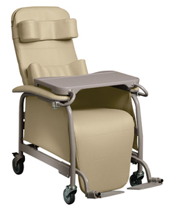 - Lumex Preferred Care Recliner. The Lumex 565 Patented recline mechanism allows for infinite positioning of recline. Reduced armrest and seat height enables the recliner to fit under dining/activity tables and allows resident to "scoot" and more easily reposition chair by themselves. Four swivel casters with two rear locking casters enable the Preferred Care Recliner to be easily maneuvered in small spaces and moved down hallways. Infinite recliner back patented mechanism provides infinite positioning of the back, ranging from 95 degrees to 145 degrees for increased resident comfort and pressure relief. The reclining back can be locked in any position by the caregiver. A unique suspension system self-adjusts to each person, cradling the resident from head to heel and virtually eliminating the risk of "bottoming out". Extra-wide padded armrests and side panels maximize comfort. Durable epoxy coated welded steel frame is easy to clean and maintain. Quick-release upholstery allows for easy cleaning, removal and replacements. Vinyl upholstered back is sulfide stain, mildew and oil resistant. A variety of accessories are available to customize the chair for specific individual needs. Lumex Wrap-Around Warranty. Welded Frame: Limited Lifetime. Upholstery: Limited One Year. All Other Components: Limited Three Year. Weight Bearing Capacity: 250 lb. Tray table and bolsters sold separately and are not included with recliner. Color: Doeskin.