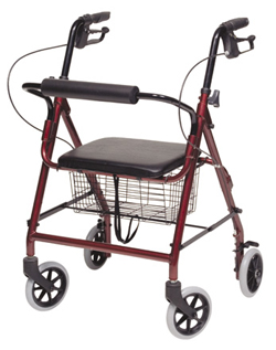 - The Walkabout Hemi Four-Wheel Rollator is ideal for the more petite user; has the same features as the Walkabout Lite with a padded backrest for extra comfort. Color: Burgundy. It folds quickly and easily into a compact unit for storage and travel. Features include a padded seat, ergonomic hand grips, and easy-to-operate hand brakes. 300-lb weight capacity. Epoxy-coated aluminum frame. Locking loop brakes. Removable wire storage basket. Adjustable handle height. 6" wheels for indoor or outdoor use. Designed to meet the requirements of HCPCS codes: E0143 + E0156. Includes laminated color operating instructions. Limited lifetime warranty. Color shown is Burgundy.