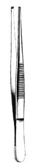 Tissue Thumb Forceps. Stainless steel. Economy. 5 1/2 inches in length. 1 X 2 teeth.