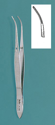 Eye Dressing Forceps, 4 in. (10.2 cm), half curved, standard pattern, 0.8 mm wide serrated tips.