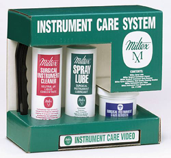 - Miltex Instrument Care System Kit includes one each of the following: Spray Lube (# 3-700), Surgical Instrument Cleaner (# 3-720), Surgical Instrument Stain Remover (# 3-740), Instrument Care Video (# 3-810), Nylon Brush and Stainless Steel Brush (# 3-1000 & 3-1001).