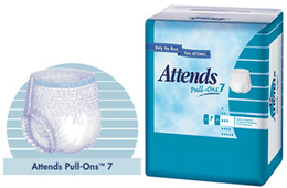 - Pull-On Attends Underwear 7. Best in class for heavy protection. Provides superior comfort and leakage protection. Leakage barriers give added defense for preventing leakage. Colored stitching indicates front. Cloth-like stretch panels and tear-away sides. Latex free. Size; Medium. Fits hip/waist size 26"-40". 20/pkg. 4pkg/cs.