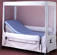 - The Canopy Enclosed Bed offers a new alternative to traditional restraints and crib beds. It can give better range of motion to a patient who needs to be protected from falls or discouraged from getting out of bed unassisted. Now available in Height Adjustable Hydraulic version. The canopy is made from Staph-Check healthcare fabric, making it bacteria resistant, fire retardant and stain resistant. It can be removed for washing and disinfecting. The large mesh panels are easy to unzip from all four sides for complete patient access. Equipment access ports allow the use of IV lines even when the bed is closed. Complete bed with padded mesh enclosure, Padded bed rails, Staph-Chek mattress, 6 fitted sheets, 6" casters (2 locking, 2 non-locking).