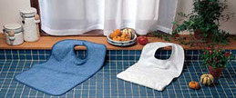 - Jumbo Terry-Cloth Food Catcher, Color: White. Easily adjustable Velcro closure and large neck opening for comfort. 90% cotton, 10% polyester. Reinforced with cotton bias binding. 18"W x 30"L. Machine washable. Latex free. Package of 3.