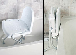 - Invacare Folding Bath/Shower Chairs. For bathing comfort and support. Features include a contoured blow-molded seat and optional backrest, 1" (3cm) anodized aluminum frame, fixed-height legs, and hand-held shower holders. Ergonomically positioned drain holes allow consistent drainage. 171/2"H x 17"D x 193/4"W (44 x 43 x 50cm). Folds down to 241/2"L x 193/4"W x 7 1/4"D (62 x 48 x 18cm). Holds up to 250 lbs. (114kg).