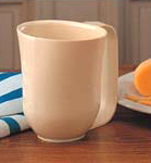 - Dysphagia drinking cup helps people who have trouble swallowing. Drinking while tucking the chin toward the chest gives normal swallowing mechanisms time to work. Design helps prevent liquids from escaping at the lips and directs the liquid to the center of the mouth. Cups provides sufficient nose clearance to empty the cup without tilting the head back. Lightweight cup features extended handle that accommodates gripping by entire hand or by the thumb only. Ideal following stroke and neurological injuries. Can also be used by people who have chronic neck pain to avoid extending the neck. Institutional dishwasher safe to 180 degrees F (82 degrees C). Color: Almond.