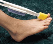 - Dr Joseph's Original Footbrush. For hygiene of lower extremities of people with limited access to their feet. Replaceable sponge tip for cleaning and applying medication between toes. Plastic contoured handle. Nylon brush for comfortable cleaning of feet. Includes wrist strap. Overall length is 24 1/2", with 3 3/4" brush and 1 3/8" wedge-tip sponge (two sponges included).