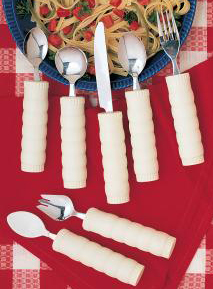 - Adjustable weighted fork. Adjust the weight of this fork according to the comfort of the user. Simply increase or reduce weight with the adjustable washer mechanism (weight can range from 2-8 oz.). Very easy to grasp. Dishwasher safe to 180 degrees. Handle is 1-1/2" diameter. Latex free.