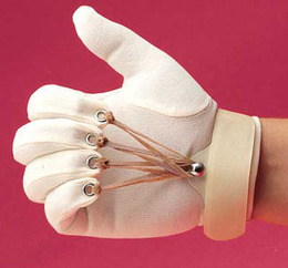 - Deluxe Traction Exercise Glove, Large/X-Large, Left Hand. Soft, comfortable stretch nylon fabric. Attach hook finger loops to the 2" wide Soft Touch D-ring Velfoam wrist strap. Comes with four rubber bands and four finger loops. Rubber bands help increase MP/PIP/DIP flexion. Contains latex.