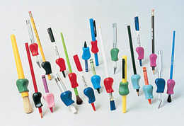 - The Pencil Grip, 12/pk. Encourages writing with full hand/arm action. Pear-shaped design promotes correct gripping and prevents finger cramping and user discomfort. Fits any standard pencil or pen. For right or left-handed users. Latex free.