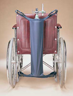 - Oxygen Tank Holder. When oxygen is required, secure it to a wheelchair with this handy holder. PVC-coated, heavy-duty, rip-stop nylon is strong, waterproof and lightweight. Top and bottom straps with buckles are fully adjustable to accommodate most sizes of wheelchairs. Straps attach at the uprights and tipping levers. Extra long straps allow the holder to be positioned off-center to avoid contact with the client's head or back. Navy blue. Fits all D and E tanks. Latex free.