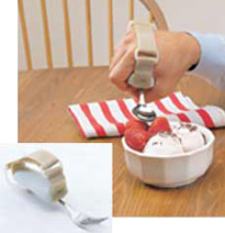 Plastic Base Utensil Holder. Half-cone-shaped plastic base angles the utensil away from the palm to make eating pattern easier. Washable nylon and plastic. Utensil not included. Latex Free.