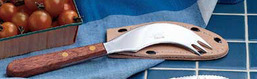 - Knife-Fork Combo 1046: 4-1/2" long, sharp stainless-steel rocker blade and fork. 4" brown wooden handle. Protective leather sheath. Dishwasher safe up to 125'F. Careful use is advised. Not to be used as a utensil in the mouth. Latex free.