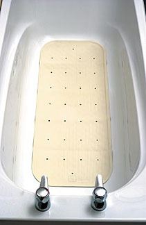 - White rubber mat with suction cups on the underside covers a good portion of the length of the bath. Prevents slipping and provides a more comfortable surface for sitting or standing. 38" x 14" (95 x 35cm).