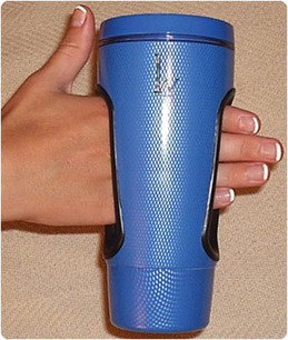 - Easy Grip "Hand in Mug". Holds 16 oz. and is dishwasher safe up to 153 degrees (top rack recommended). High-quality polycarbonate is extremely strong and does not warp. Lid has easy open/close lever and rotates 360 degrees.