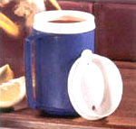 - 12 oz. insulated mug with lid. A polypropylene mug with an easy-to-grasp handle. Use for either hot or cold liquids. Lid regulates flow of liquids. Latex free. Not microwaveable. Dishwasher safe up to 180 degrees.