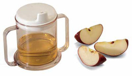 - Transparent mug with two handles. Clear, high-strength plastic with dual handles for a secure grip. Wide base helps prevent tipping. 10-oz. capacity. White spouted lid. Dishwasher safe. Latex free.