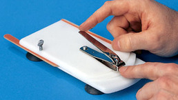 - Easy to Use Nail Clipper/File. A suction cup base holds the platform of the nail clipper/file in place on any smooth flat surface, so you can trim your nails. Just place your fingertips on the front of the platform and press down on the clipper to trim your nails. Emery boards included in the vertical and horizontal side slots. Latex free.