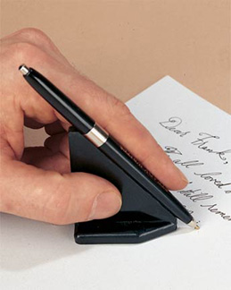 - Steady Write Pen. Helpful for those who have Parkinson's, arthritis or limited use of hands. Permanently attached base stabilizes hand at a special angle to smooth out shaky or poor handwriting. Grip with fingers held between knuckles, or grasp like an ordinary pen. Black ink. Latex free.