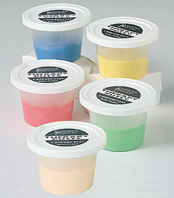 - Economical. Bleedproof, nontoxic, clean and non-oily, Therapy Putty leaves no residue and won't fragment, separate, stain or stick to skin. Six distinct colors/consistencies reflect established standards in resistive exercise: progress from super soft tan to extra firm gray. Putty can be squeezed, stretched, twisted or pinched to meet a wide range of strengthening needs, or used to encourage heel strike and strengthen foot muscles. Combine colors to create custom resistance to meet individual needs. Nontoxic. Latex free. Available sizes: 2oz, 3oz, 4oz, 6oz, 1lb, 5lbs. Tan, 5 lb. (2.3kg).