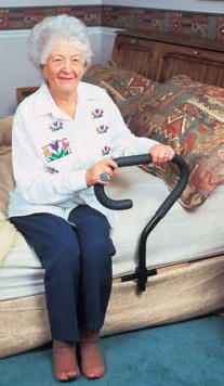 - BedCane Aids Independent Movement In and Out of Bed. Heavy gauge steel, wide handle with cushion grip provides support getting in and out of bed. Base is placed under mattress and safety strap secures base to bed. Removable pin makes the BedCane collapsible for storage and portability. The BedCane provides independence to a multitude of needs - elderly, disabled, overweight, injury recovery, pregnancy and more. Adjusts in height 19" to 22" from base. Fits twin, full, queen, and king size beds. 300 lb weight capacity.