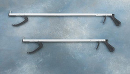 - Featherweight Standard Reacher, 26" long, 7 oz. Constructed from lightweight aluminum, this reacher is designed for people with limited reach or strength. A 2 1/2" jaw opening has rubber tip to assure a secure hold on items. Includes a magnet for picking up metal objects and a post on the end, which can be used to pull items close or as an aid with dressing.