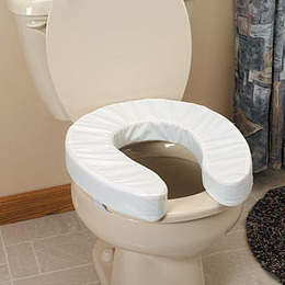 - Padded Toilet Seat Cushion with Cut-Out, 4 in. (10 cm). High-density foam provides elevation, support, and comfort. The supple Sure-Check vinyl cover provides antibacterial protection and is soft to the touch. 4 hook & loop straps secure the cushion to the toilet seat. Cut-out front allows for easy transfer and personal cleaning. Seat 14"W x 16 1/2"D (36 x 42cm).