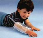 - Easy-to-fit Urias Pressure Splints provide therapeutic, even pressure on arms, legs, hands and feet when used for neurological rehabilitation. Made of a double layer of washable PVC sheeting, each splint features a plastic zipper closure and is transparent to facilitate positioning. They are applied to a client's limb and then inflated. During inflation the soft inner layer molds exactly to the limb, providing all-over, even pressure when inflation is completed. Inflation can be only accomplished orally, with the use of a personal/disposable mouthpiece and a mouthpiece filter, or with the Hand Pump with Safety Valve. All Urias Pressure Splints are latex free. NOTE: Inflation pressures should not exceed 40 mmHg. Urias Pressure Splints Benefits: 1) Counter abnormal tone development - Applied following brain damage due to strokes, these splints inhibit spasticity, assist movement patterns, expedite weight bearing and reduce edema. The dynamic force of these pressure splints encourages sensory recovery by stimulating proprioceptors. 2) Inhibit development of contractures in neurological disorders - Where a contracture is already present, Urias Pressure Splints may be used to stretch it, gradually reducing the deformity. 3) Apply as cold packs - just fill with water and refrigerate. 4) Available in sizes for adults, infants and children in a variety of lengths. To determine correct splint size, measure the length of the extremity and refer to the sizes shown. Shown measurements are splint sizes before inflation. Length: 8", Type: Infant, Chambers: Single.