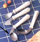 - Easy-Hold Offset Spoon, Right Hand. Design makes gripping tableware as effortless as possible. Features polypropylene handle. Ideal for those with decreased upper extremity control. Measures 7-1/2" long. Dishwasher safe up to 180-degrees F. Handle is 4-1/2" long. Handle is 1" to 3/4" in diameter. Latex free.