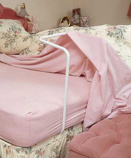 - Adjustable Bed Cradle. Adjusts in height from 15" to 23-1/2"; 14" wide. Keeps covers off legs and feet. Can be used at the side or end of bed. Base slips between mattress and spring. Two part frame facilitates storage and transporting.