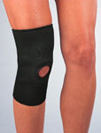 - Neoprene Knee Support Small, Black Knee Circumfrence: 12" to 13-1/2". Nylon-covered neoprene provides support, compression and warmth for knee strains, sprains, arthritis, and post-operative rehabilitation. Patellar cutout ensures appropriate patellar positioning. Outer edges are double stitched for durability. Hand wash. To size, measure circumference at center of knee.
