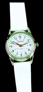 - Chrome Case, White Leather Strap, 24-Hour Dial. Designed for today's healthcare professional. Prestige Medical's classic watches feature quartz movements, step second hands, water resistant cases, and genuine leather straps (unless specified otherwise). Lucite watch box.