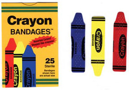 - Decorated adhesive bandage. Stat-Strip bandage wrap for quick and easy opening, even with gloves. Can be applied without touching the pad or adhesive. Lessens potential to contaminate wound. Long-lasting sure stick adhesive stays secure-even when wet. Crayon bandage are bright colors and unique shape. 5/8" x 3" Red, Yellow and Blue Crayon-shaped strips. 100 strips per box, 12 boxes per case.