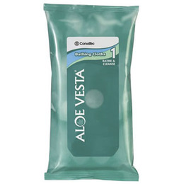 - Aloe Vesta Bathing Cloth by ConvaTec. Complete no-rinse bathing system. Cleanses and moisturizes skin. Eight individual pre-moistened cloths clean essential body parts. Rinse-free cleaner removes debris without irritating skin, leaves skin feeling smooth and soft with no sticky residue. Suitable for incontinence cleanup. Compatible with normal pH of skin. Fresh scent pleasant to both patient and caregiver. Contains dimethicone. Thick, soft, premium grade bathing cloths. Size is 8"x 8", 8 towelettes per pkg, 24pkg/case