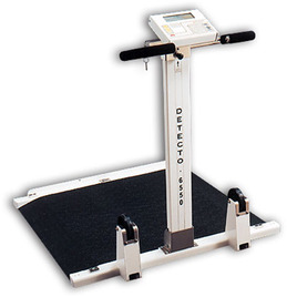 • Portable wheelchair scale is a popular lightweight USA-made scale that offers a wide range of versatility. It can be used with wheelchairs, straight-legged chairs or as a stand-on scale, and its sloped ramps offer versatility by allowing entry from either side. The 6550's vertical fold-up feature and heavy-duty wheels contribute to its ease of mobility in four directions and minimal storage space needed. The 650's digital weight indicator is the industry's most advanced, featuring serial, USB and optional wired and WI-FI Ethernet output, BMI calculation, yellow "quick keys" for basic weighing, 350 degree rotating mounting bracket for viewing in all angles, and an easy-to-read blue LCD display. Platform measures 30 x 32 inch (76 x 81 cm). EMR/EHR ready. 1,000 lb x 0.2 lb/450 kg capacity. OIML EC Class III model available.