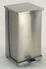 - Stainless Steel Step-On Can. Capacity: 32 quart (8 gallon). Feature unitized contruction, full-width hinges for long life, heavy-duty foot pedal and linkage system, self-closing lid and bag-security mechanism. Plastic protective molding hems bottom of epoxy polyester cans. "Bio-Hazard" and "Infectious Waste" adhesive-backed identifying labels included FREE. 21"H x 11.75"W x 13"D.
