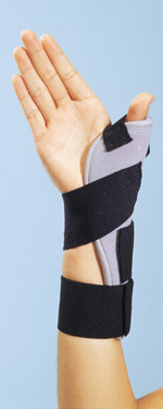 Abducted Thumb Spica -Universal. Foam laminate construction with contact closure. Right sides splint. Length: 9".