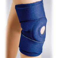 - Safe-T-Sport EZ-ON Thermal Neoprene Universal Knee Wrap. Neoprene wrap can be easily applied to swollen or injured knees. Has open popliteal to prevent bunching at back of knee. Includes a rubber donut for added patella stability. Donut can be removed or cut to a superior or inferior horseshoe. Made of 3/16" thick neoprene with a soft terry lining. Velcro straps can be applied anywhere on support. available with open patella. Wrap design fits a range of sizes. Color: Navy. Universal sizing, fits 12-21".