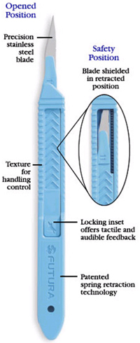 Featuring unique automated retraction technology, the Futura line of safety scalpels offers one-handed safety activation away from the blade in order to protect the caregiver from accidental injury and exposure to infectious disease during surgical procedures. Designed to inhibit unprotected, "in-between" blade positions, the patented spring activated mechanism provides user control to access or hide the blade. A safe alternative to traditional OR blades, these scalpels are versatile for diverse floor use applications. Color coded by blade size for easy identification. Completely disposable. Green, #10.