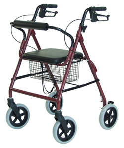 - The Walkabout Deluxe rollator offers the same benefits as the Walkabout Lite rollator, while featuring heavy-duty 8" wheels that are ideal for outdoor use. It folds quickly and easily into a compact unit for storage or transport, and comes complete with a padded seat, a backrest for extra comfort, ergonomic hand grips, and easy-to-operate hand brakes. Epoxy-coated aluminum frame. Locking loop brakes. Removable wire storage basket. Adjustable handle height. Heavy-duty 8" wheels for indoor or outdoor use. Designed to meet the requirements of HCPCS codes: E0143 + E0156. Includes laminated color operating instructions. Limited lifetime warranty. 300 lb weight capacity. Color: Burgundy.