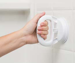Traveler Safe Grip: Portable balance assist for shower or tub. Take it with you anywhere. Suction cup design attaches easily to shower or tub rail. Installation and removal is a snap. 4" width.