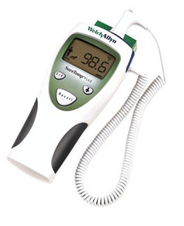 - SureTemp Plus 690 Electronic Thermometer with 4 ft. cord and Rectal Probe with Rectal Probe Well. Speed, accuracy, security, and convenience in a single thermometer. Monitor mode capability for measuring 3-5 minute temperatures. Used probe covers may be ejected automatically. Large LCD displays temperatures in Fahrenheit or Celsius. Has last temperature recall capability. Waterproof, stainless steel probe shaft. Convenient storage housing for 25 probe covers. Color-coded, interchangeable and removable probe well to minimize the risk of cross-contamination. Rubberized grips for ease of handling. User-selectable icon and/or words for identification of thermometer modes. Battery life indicator.